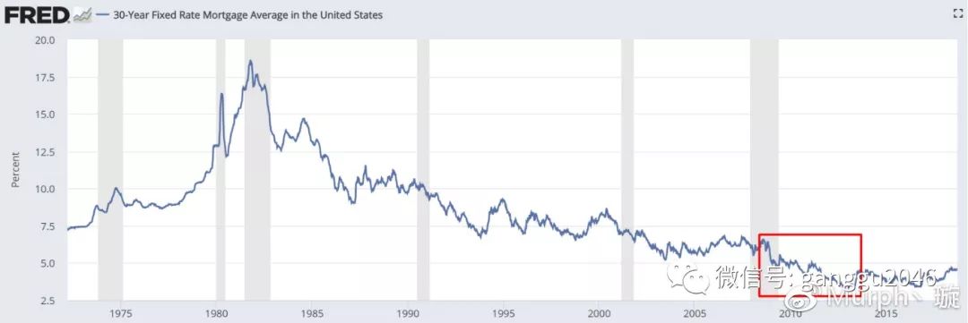 如图为美国三十年房贷利率,我们的关注点是红色方框里的那一段时间。在那段时间里,美联储通过量化宽松政策,将房贷利率从6%压低到了3%。而我之所以要把这么多数据都截下来就是为了让大家看看它在历史上可是从未低于过5%。