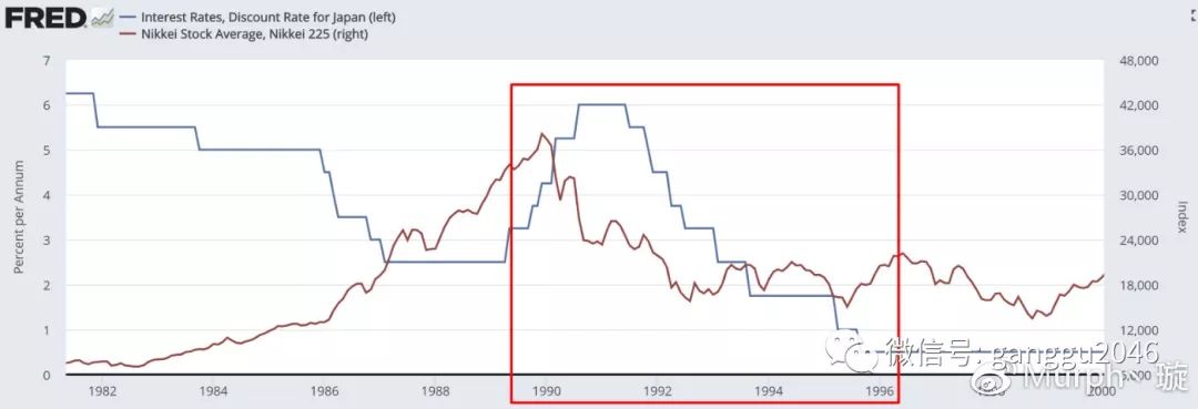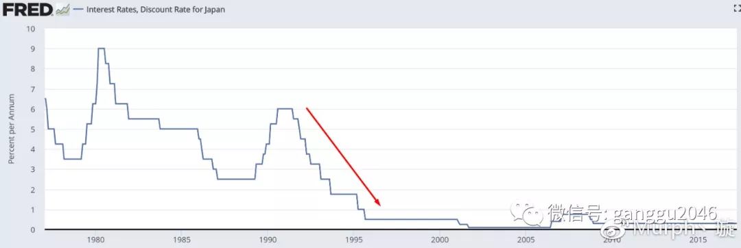 如图为日本的利率,从1990年危机爆发后就几乎一直是0%。