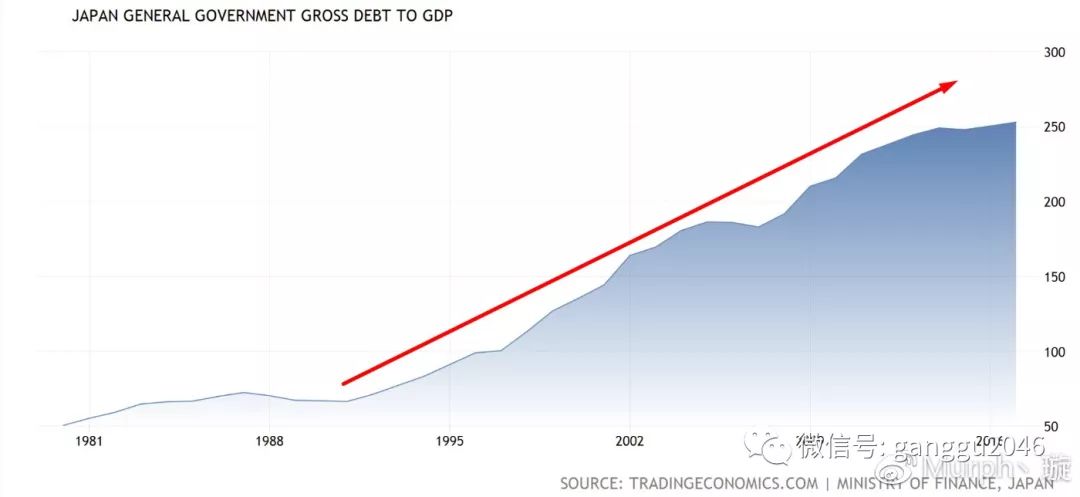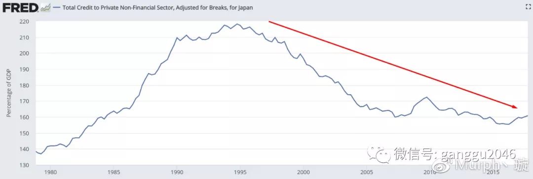 如图,日本在1990年爆发经济危机之前的十年中也有债务与GDP的比飞涨的现象,因为它也经历了严重的房地产泡沫。我们都知道,危机之后,日本房价下跌了近三十年(下跌幅度超过65%),日本经济陷入了失去的三十年。