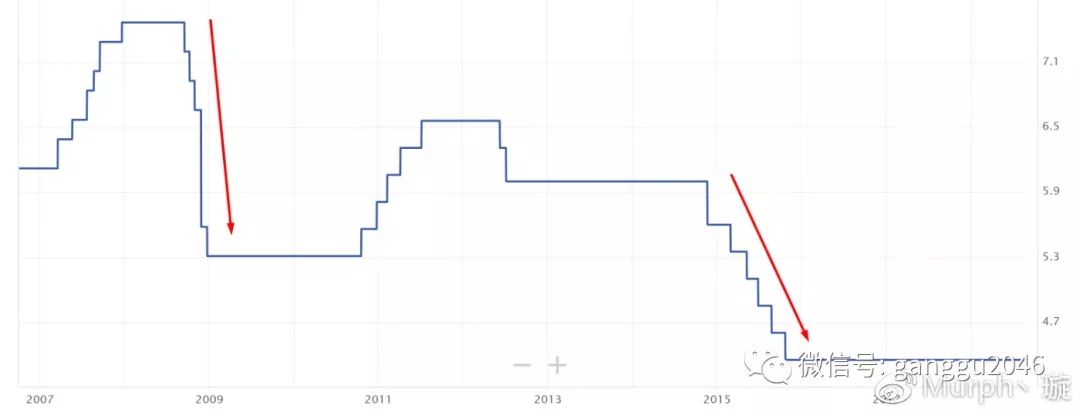 如图依然为美国利率,在次贷危机时,美联储更快速的降低了利率,甚至把利率降到了零。