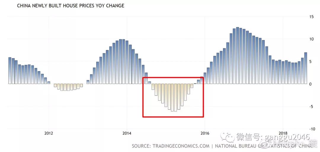 如图为中国房价的涨幅,其实我们看到2015年年初时房价已经开始下跌了(小循环开始向下),但是政府的救市又让它在2016年大涨。我认为中国2015年的那次救市非常像美国的2001年。“房价永远涨”的神话也是从那时开始,因为这不,政府确实救市了呀?如果政府不愿让房地产下跌,那么它怎么可能下跌呢?