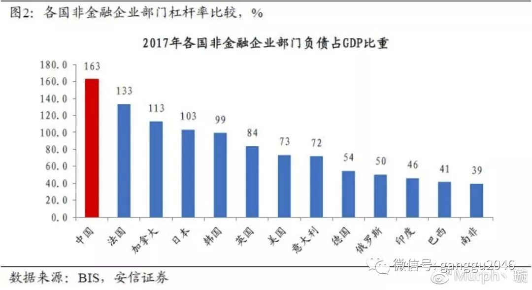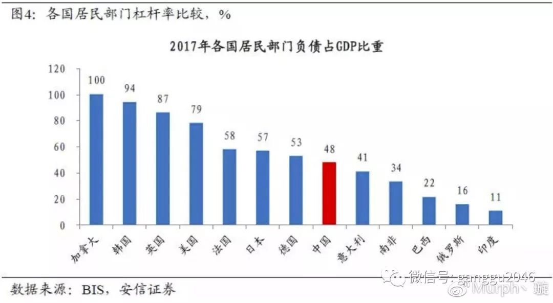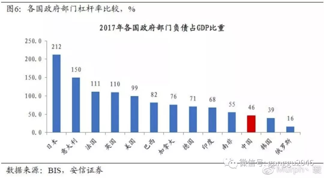 可以看出,中国的政府债务(中央+地方)还是很低的。需要注意的是,我们知道地方政府有很多融资平台,这些债务都被算在企业债务里了,而没有算在地方政府这里,所以地方政府债务有所低估,企业债务有所高估。