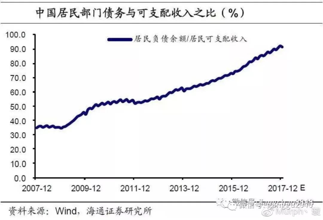 不过居民债务不算特别高。但是问题在于,中国居民的收入占GDP的比也很低。所以如果我们算居民债务与可支配收入之间的比,根据海通证券首席经济学家姜超的计算,已经达到了90%,如下图,
