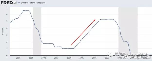 如果你看过《大空头影评 —— 次贷危机十周年》那篇文的话,可真是帮了我的大忙。 在那篇文中我写到,2004年年中,由于美国入侵伊拉克令国际油价暴涨,再加上长期的低利率政策导致的货币过剩,时任美联储主席的格林斯潘开始加息以应对通货膨胀,如图,从1%一路上调至5%。美国的房地产价格也开始在2006年回落。