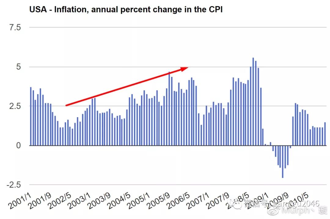 美国通胀率,从2002年的1.1%一路涨到2005年的4.6%,导致美联储在同一时间内不断加息抑制通胀。