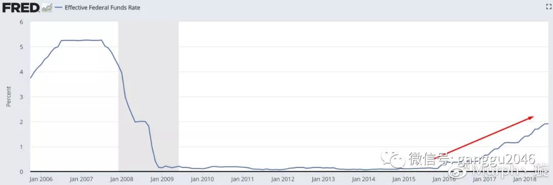 如图为美国的利率,在实行了长时间的零利率政策后,美国经济终于开始复苏,美联储也于2016年开始加息。2017和2018年两年更是每年加1%。