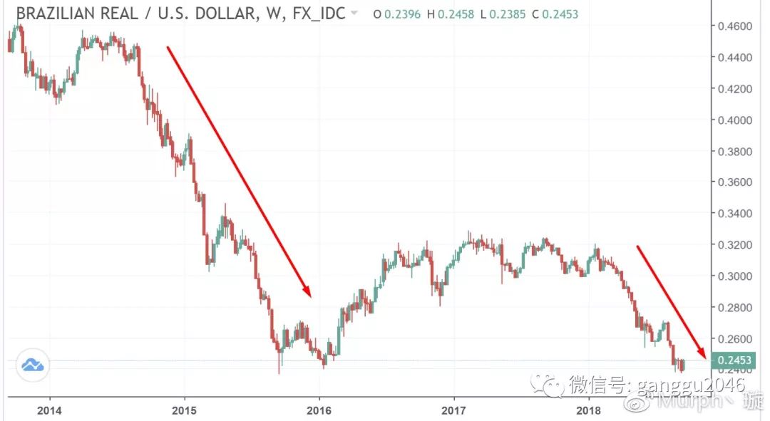 2014年,由于政治危机加上办世界杯,奥运会的劳民伤财,巴西遭遇了经济衰退,Real兑美元一路下跌近50%。而今年一月份开始,由于选举的不确定性(民粹主义者可能上台),Real再次大幅下跌25%。