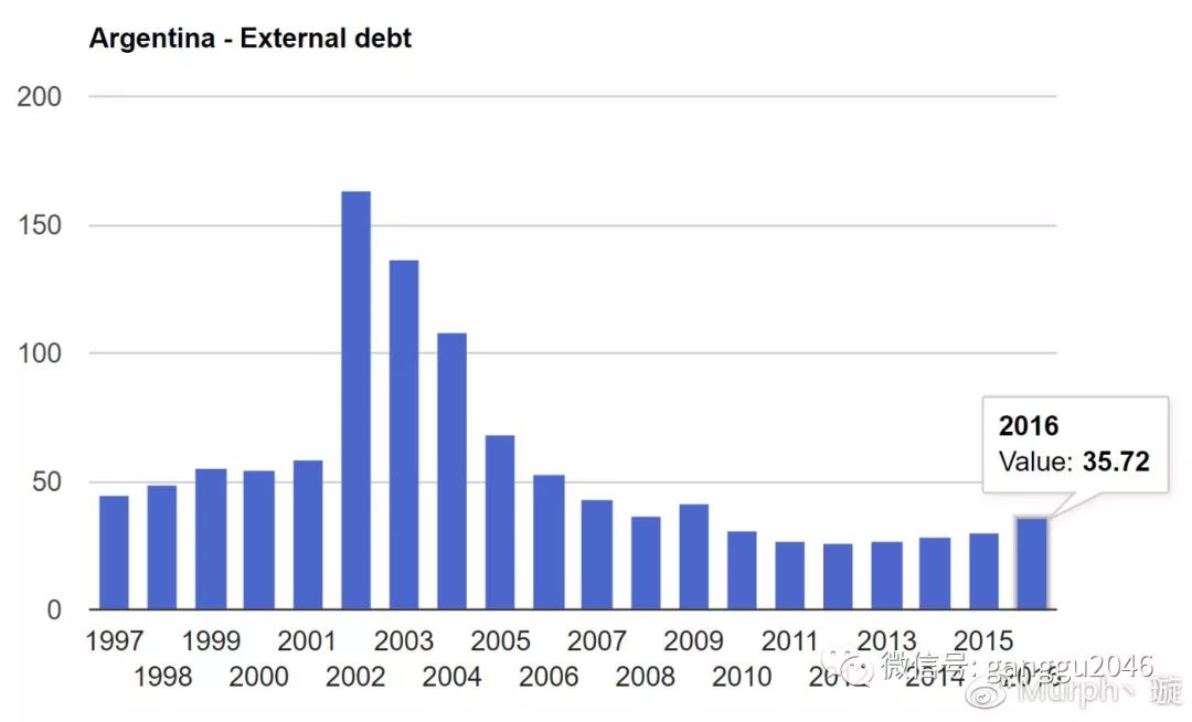 如图,可以发现阿根廷过去这几十年来外债规模一直不低,在2016年也高达35%。因此,当次贷危机到来时,阿根廷马上遭遇了恐慌。