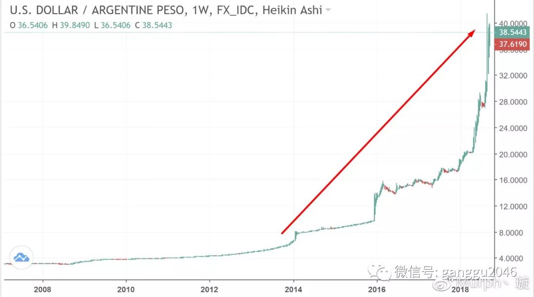 如图为美元兑阿根廷比索的汇率,可以发现,从次贷危机开始,阿根廷比索就一直在贬值(图示为美元在升值),累计已经超过了90%!