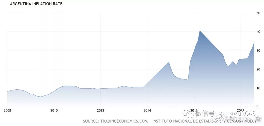 如图为阿根廷的通货膨胀率,一直没有低于过10%,近几年更是达到了40%。来自阿根廷的好友对我说这个国家目前已经乱到了没人敢携带好东西出门的地步。如果开一辆好车出门,那么非常有可能会被当街抢走。