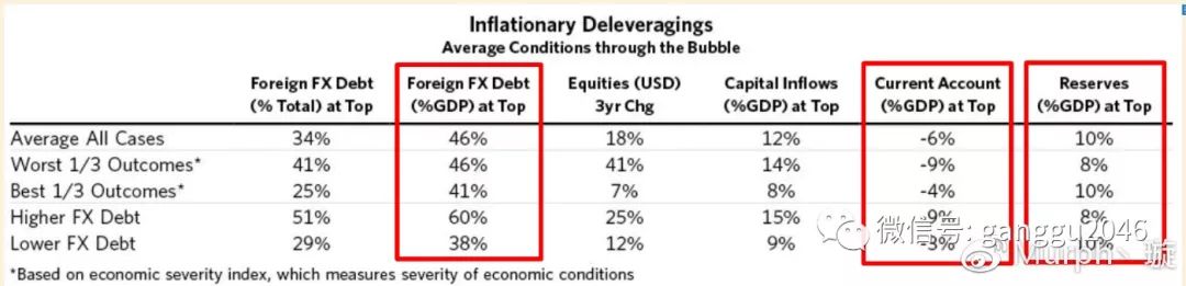 上图为Ray整理的所有发生过货币危机进而导致通货膨胀案例的一些数据,我圈出了三个最重要的,分别是外债占GDP的比 —— 平均值为46%,中国为13%;经常账户(贸易是顺差还是逆差)—— 平均值为负6%,中国为正1.75%;外汇储备占GDP的比 —— 平均值为10%,中国高达23%。