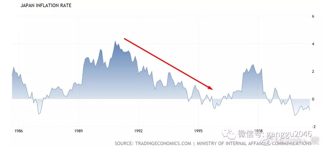 如上图为日本的通胀率,从1990年的4%下滑到了1996年的负值。在经济中,这种类型的通胀率下滑(不是那种从百分之十几往下滑而是从低点开始)比通胀率上升要可怕的多,因为通胀下滑意味着商品的售价下降,进而意味着企业收入减少,而企业收入减少则意味着企业要削减支出 —— 裁员,进而导致居民的收入减少,更买不起商品了,商品的售价更加下滑,进而变成恶性循环,让经济陷入严重的衰退。日本毫无疑问正是在那些年经历了这一惨痛的教训。