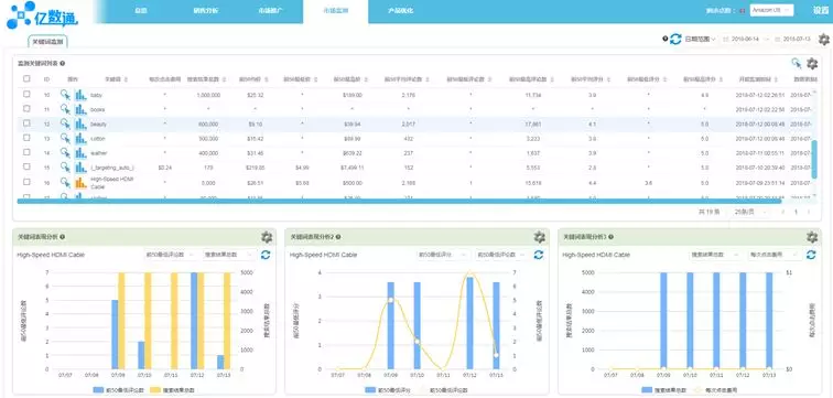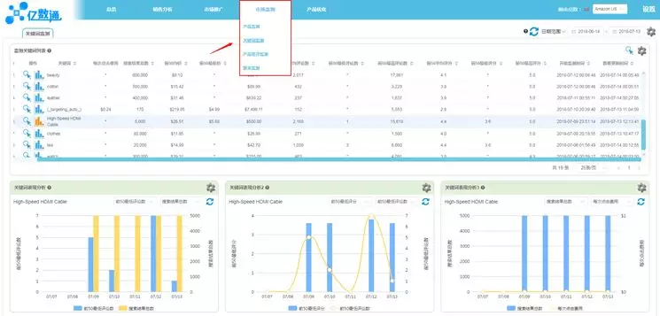 1)登录亿数通系统,在页面顶端将鼠标悬停在市场监测,进入下拉菜单,点击关键词监测,进入关键词监测页面。