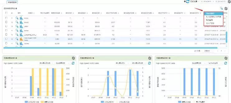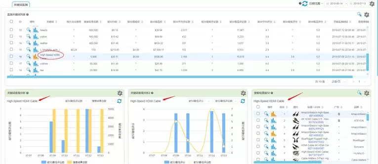 3)操作第一组数据,点击 监测关键词列表 中High-Speed HDMI Cable前的柱状图标,之前已关联好的关键词表现分析,关键词表现分析2及搜索结果前 50三个分析器将随之联动,通过关键词的转换比对,在搜索结果前50 中确认进一步分析对象。