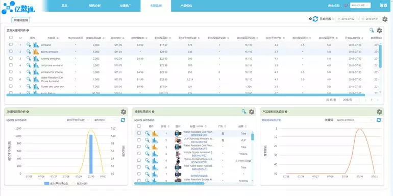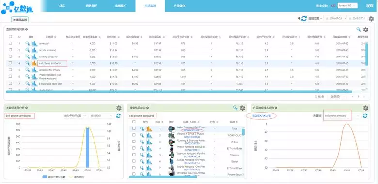 4)查看监测关键词列表中关键词 Cell phone armband,点击产品图片前的分析按钮,关键词表现分析 中即会显示被点击关键词的图表数据,搜索结果前50 即会显示该关键词搜索结果排名前50的产品,点击 搜索结果前50 产品前的分析按钮,搜索排名趋势 中即会出现该产品在该关键词下的变化趋势。