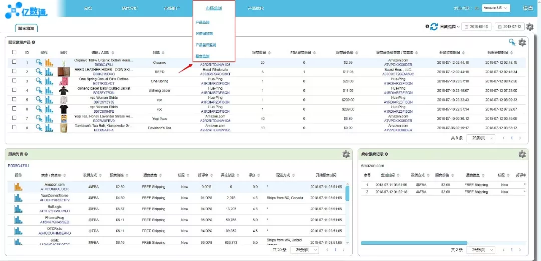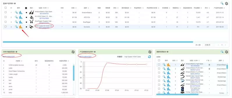 5)操作第二组数据,点击监测产品列表1中的标题前的分析按钮,则之前已关联的 分析关键词列表1和产品搜索排名趋势1分析器将随之联动。