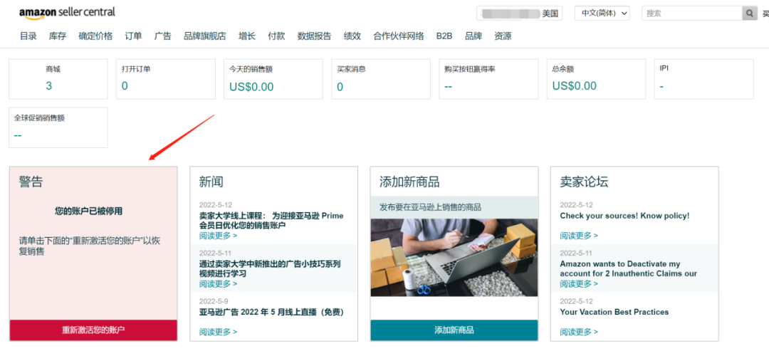 STEP 1: 点击“重新激活您的账户”进入账户状况页,点击“查看申诉”。