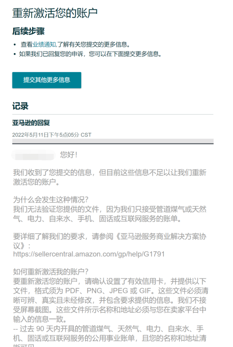 STEP 3: 等待几天,如果还是无法通过,这时进行第二次提交信息,可以提交新的账单,这时可以编辑其他信息了,要把所有相关的信息进行陈述,会更容易通过。若通过,亚马逊会发来邮件通知下一步操作,完成即可。