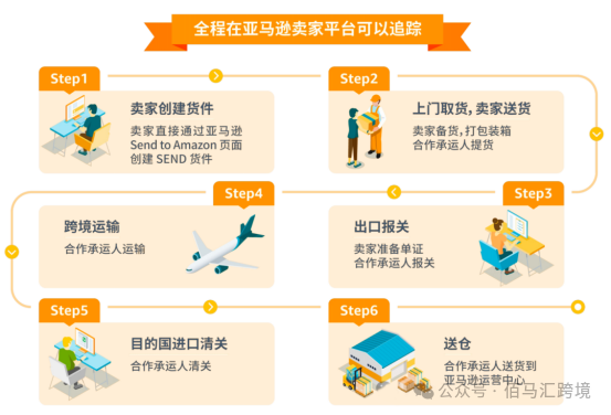 Amazon SEND(亚⻢逊跨境承运伙伴⽅案),指由亚马逊筛选的物流合作承运⼈将卖家⼊仓货件从中国发往⽬的国的亚⻢逊运营中⼼,为卖家提供⼀站式FBA头程⼊仓服务。具体处理流程如下:
