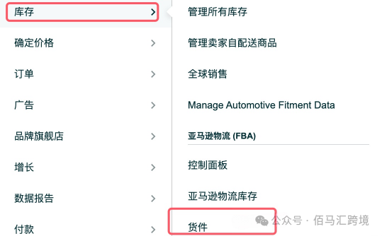 1.登录亚⻢逊卖家平台,点击“库存>货件”。