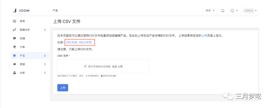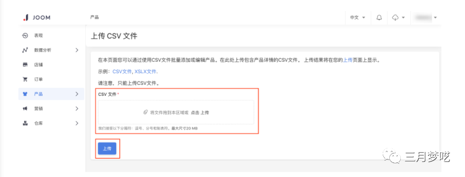 ⚠️ 请注意:对于上传,Joom只接收CSV格式的文件。如果您的原文件格式为XSLX,您需要将其保存为CSV格式后再上传。