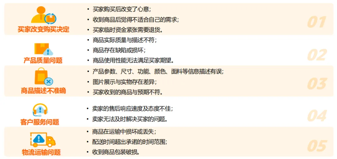 想要解决问题,先得知道问题出在哪儿。根据亚马逊的数据,退货主要有以下五大原因: