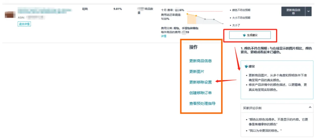 退货评论、商品评论等信息来源通过AI分析形成的退货详细原因。点击”生成建议”,结合对应买家反馈/评论佐证其生成的建议。卖家也可根据这些建议直接采取相应的行动。
