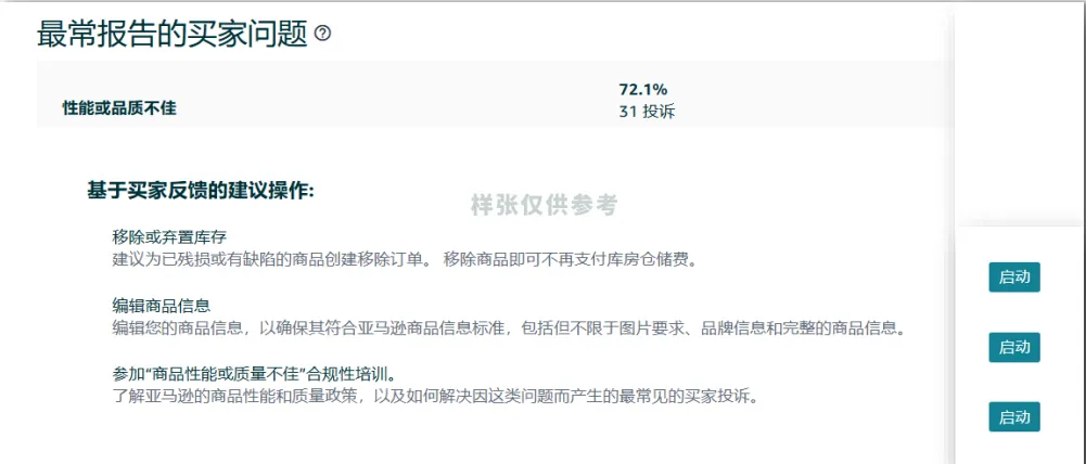 详细的负面反馈内容与占比,提供具体行动建议(如优化Listing、检查库存)