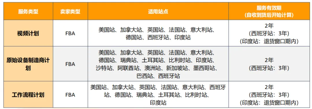 下方表格详细说明了查看商品生命周期支持各项服务适用的卖家类型、站点和服务有效期。