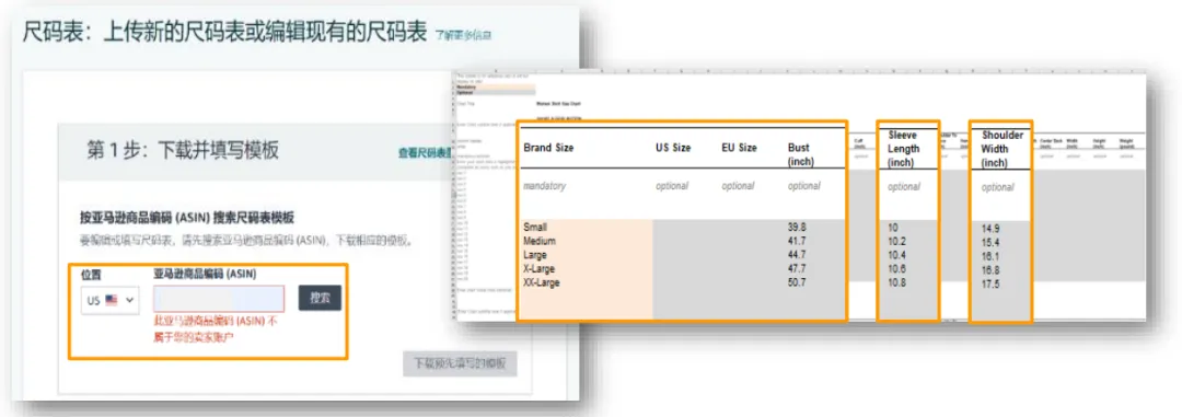 登陆卖家平台的“添加尺码表”页面,选择站点及ASIN,下载尺码表模版,并完成填写。