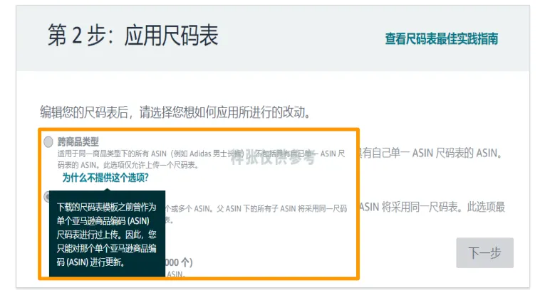 ①“跨商品类型”应用尺码表:对某一商品类型(如连衣裙或裤子)的所有ASIN应用同一尺码表。