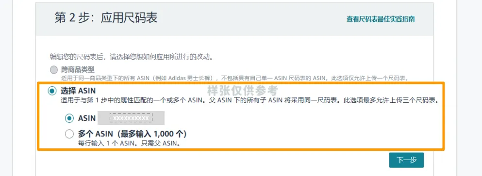 ②“选择ASIN”应用尺码表:对单个或多个ASIN应用尺码表。