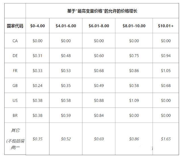 如果产品未针对某一国家(或地区)设置国际运费,则根据该产品的“最高变量价格”和现有的最高的SKU运费允许的增幅(见表1)为该国设置国际运费。