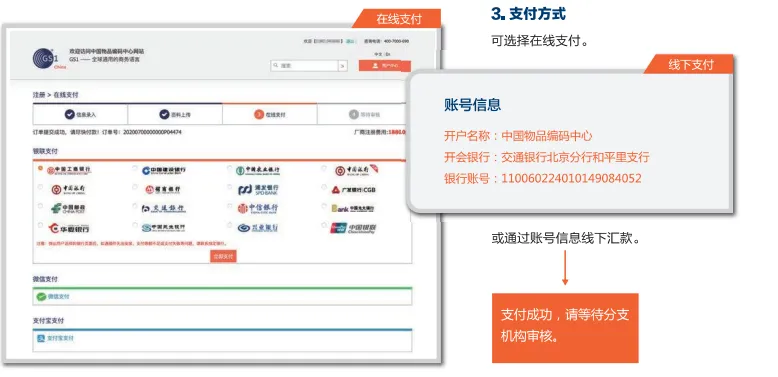 说“支付成功”一“分支机构审核”一,“中国物品编码中心审核"