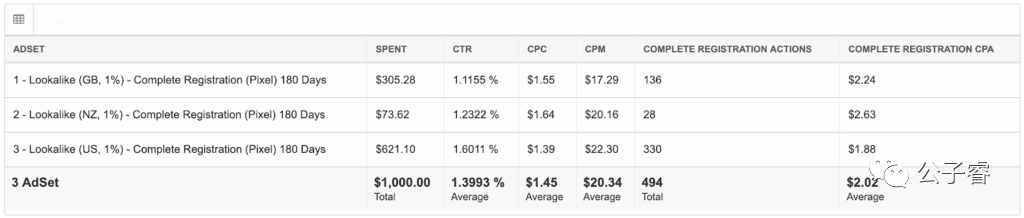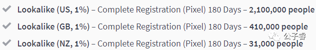 首先AdEspresso将他们之前的webinar注册的用户数据来做lookalike受众,分别取美国,英国,以及新西兰1%的Lookalike受众。