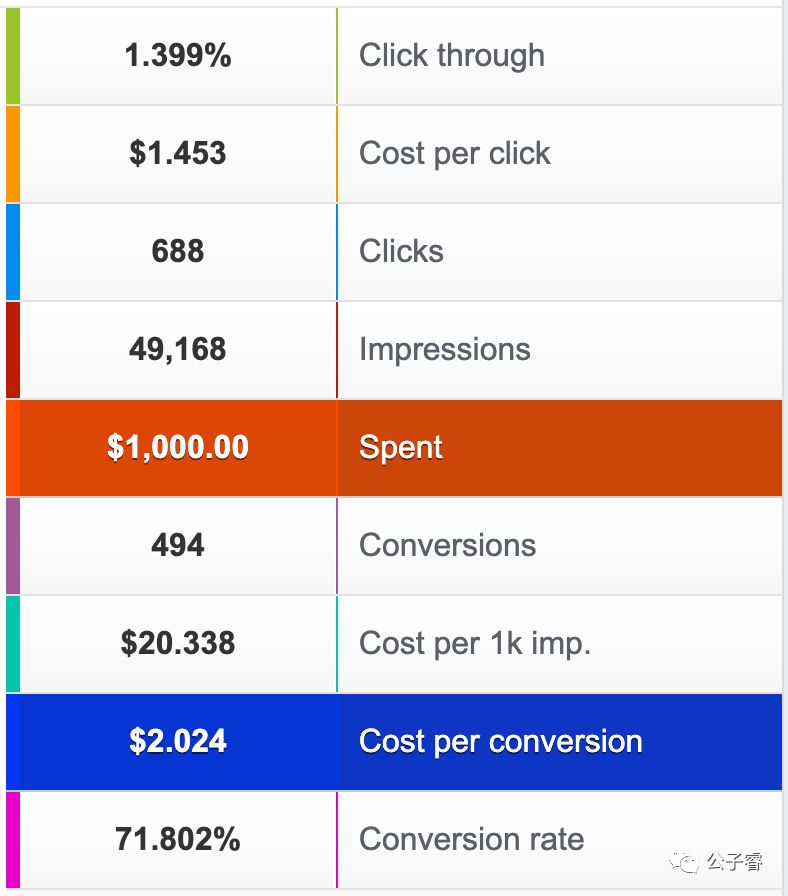 最终获得了494个注册,每个注册的成本是2刀左右。下面是完全的结果: