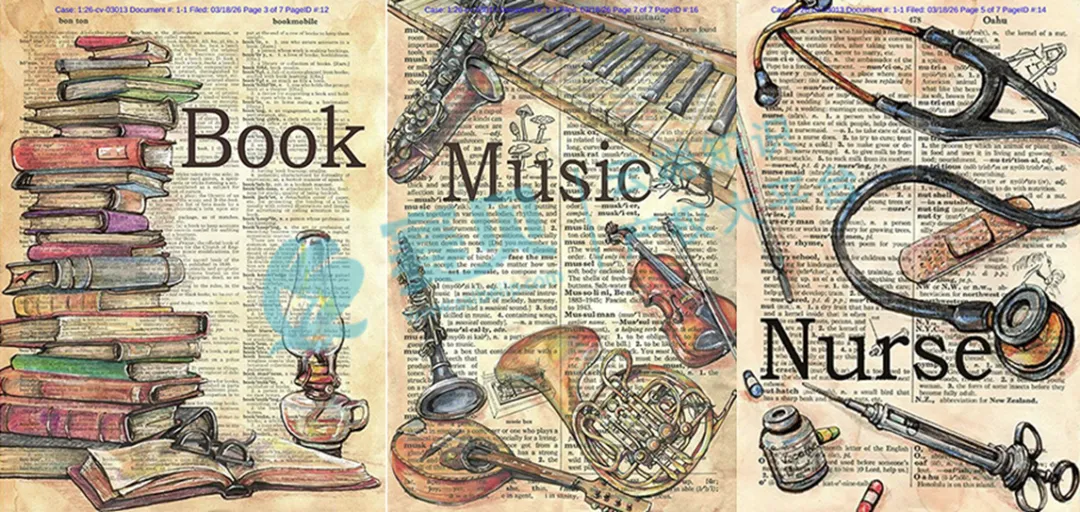 从赛贝TRO案件查询系统获悉,美国伊利诺伊州北区联邦地区法院受理的26-cv-3013号TRO(临时限制令)案件进行预警,原告为美国艺术家Kristy Beth Patterson,其核心维权内容为基于废旧词典页面创作的2D插画作品(涵盖Book、Nurse、Music三大主题)