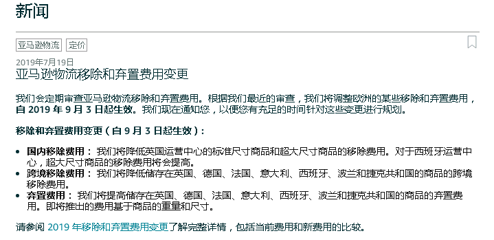 亿恩网了解到,9月3日起,亚马逊将调整FBA移除和弃置费用,此次费用调整主要针对欧洲站卖家。据悉,此次调整主要从两个方面影响卖家,首先是跨境移除费用变得更便宜了,其次是弃置大尺寸商品将更加昂贵。