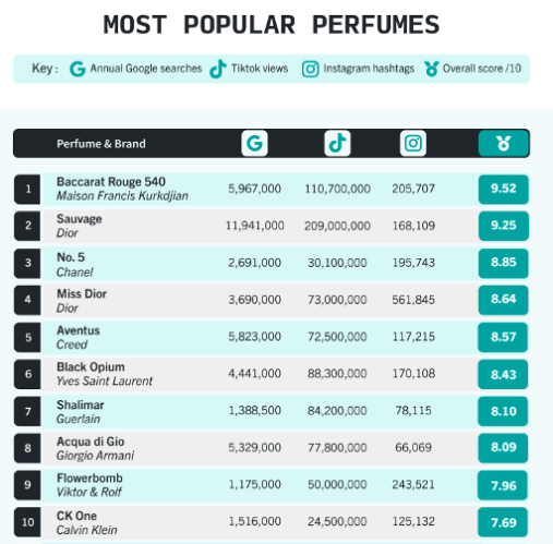 社媒方面,Sauvage在谷歌上的搜索量超过1000万次,是TikTok和Instagram上的第二大话题香水。