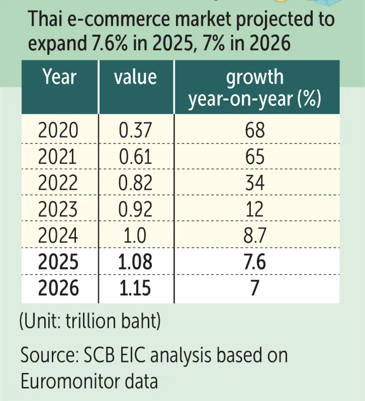 预计今年泰国电子商务市场将进入常态化增长期,增速约为 7%,市场规模预计达到 1.15 万亿泰铢。尽管这一增速相较于去年的 7.6% 略有放缓,但市场内部的结构性调整却异常剧烈,尤其是平台竞争格局发生了里程碑式的变化。
