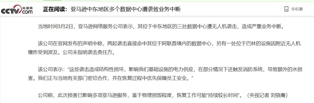 据央视新闻报道,当地时间3月2日,亚马逊网络服务公司(AWS)正式确认,其位于中东地区的三处数据中心遭受无人机袭击,导致严重业务中断。
