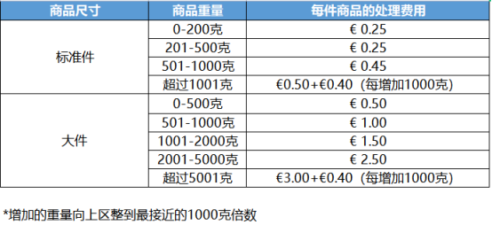 商品处理费:按件计算,每件商品的具体费用取决于商品尺寸和重量