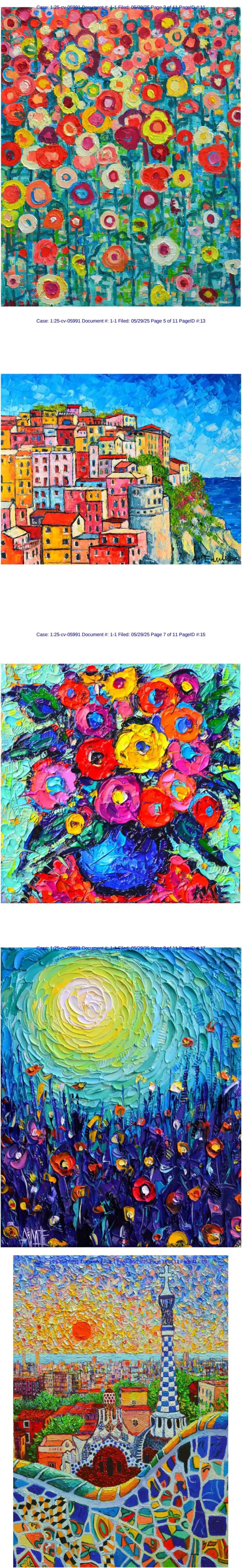 原告 Edulescu 是一位专业的全职艺术家,专攻厚涂调色刀油画。她的风格融合了纹理印象派和抽象具象,并受到表现主义和野兽派的影响。除了城市景观,她还创作花卉、动物、风景、肖像和非具象抽象画。她创作的一大特色是运用厚重的纹理和鲜艳的色彩来传达蓬勃、活力和喜悦。