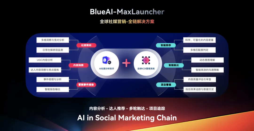 作为AI战略的核心载体,企业自研的BlueAI多模态营销应用引擎,已脱离“单点碎片式的智能爆发”,将进化方向聚焦在“全链路AI化”和“端到端优化”能力和服务构建。通过整合自身过往服务十万余客户所沉淀的行业洞察、实战数据与全球资源,BlueAI以“全链路AI产品矩阵”为核心,构建了适配全球社媒洞察与智能KOX建联与管理(麦浪引擎)、广告创意洞察与智能广告投放(AdsWin)、视频理解与生成(心影创作平台)等不同场景的智能引擎,实现“人机同频”的敏捷营销。其突破性也在于「内容洞察-策略生成-创意生成-智能投放-智能追踪复盘-策略优化」全流程的覆盖与打通,并针对全球化本地市场进行了深度推荐优化,通过实时数据回收构建动态优化的“数据飞轮”,使AI在营销实战场景中越来越聪明。
