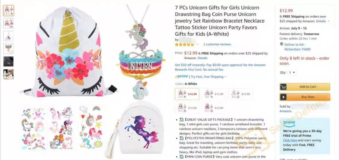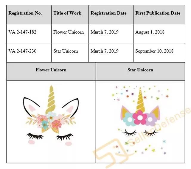 本案诉状中提到,被起诉的这些卖家就用了独角兽的版权,主要涉及Flower Unicorn 小花独角兽和Star Unicorn 星星独角兽两个图案版权。两个图案版权注册时间都为2019年3月7日,第一次使用也都在2018年。注意版权和商标不一样,注册商标会有类目限制,例如注册大类属于025服装鞋帽类,所以这一类产品用到此商标就算侵权。但是版权没有,不管你是什么类别的产品,只要用到了下面两款独角兽的卡通形象,都算版权侵权: