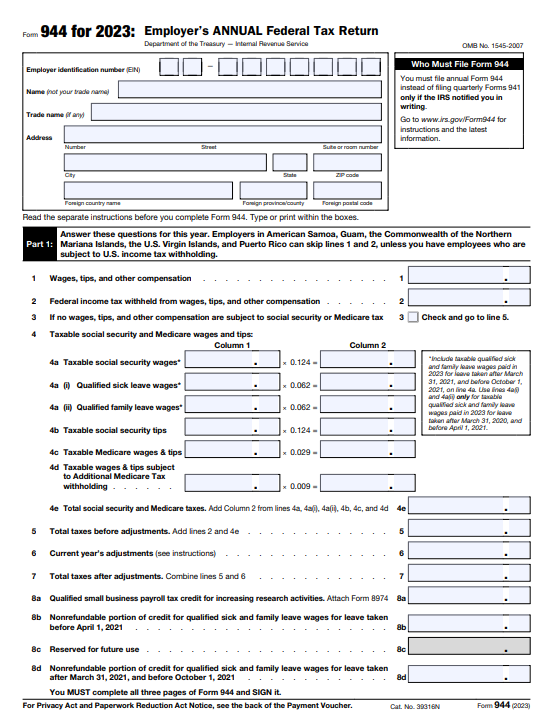 944表:年度联邦纳税申报表,用于报告雇主的年度联邦所得税预扣款和社会保险税款。与季度申报的表格941不同,雇主需要在每年的1月31日前向美国国内税务局(IRS)提交表格944。