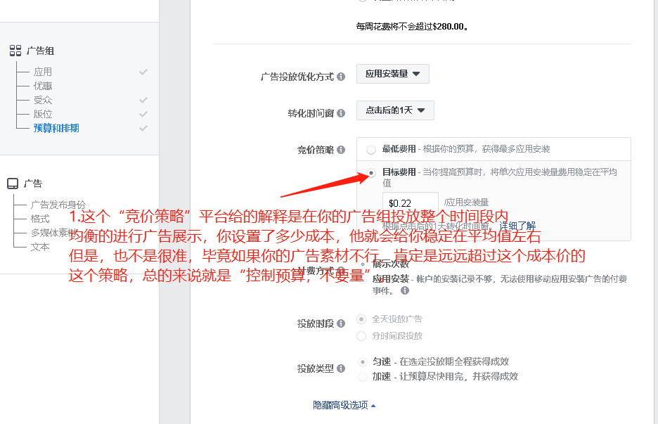 - 如果你的其他时间比较忙,不能时刻盯着广告投放账户的话,可以设置为这个策略,等有空了来看看就好。