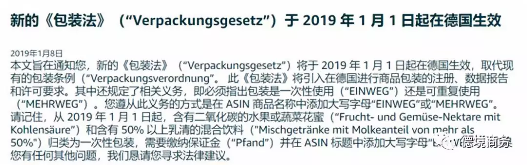 首先经过德境商务在亚马逊官方论坛的调查,了解到这个通知最重要的信息是告诉你新包装法的生效日期,引入了新的规定,而且每一个商家都有义务遵循。至于是标记“EINWEG”还是”MEHRWEG“,这并不是每一个类别都需要加入的,目前只针对饮料这个类别有义务而已。所以如果你的产品不是贵州茅台或是二锅头一类的话,那么暂时不需要标记这个内容的。