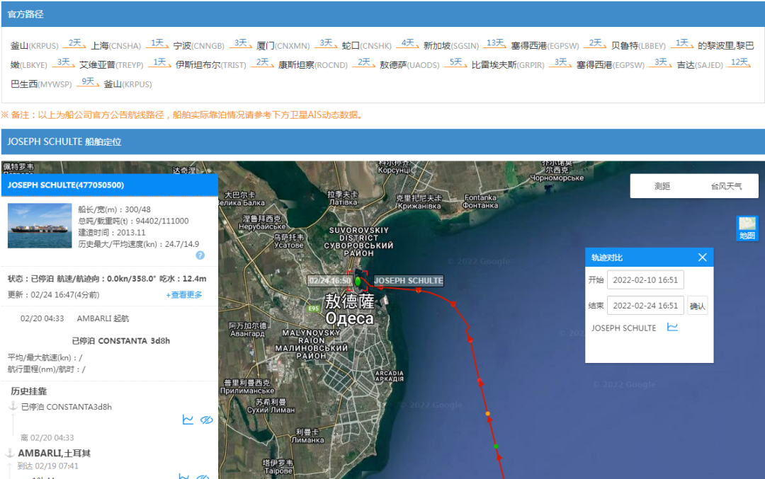 俄军登陆的敖德萨市以港口闻名,敖德萨港是乌克兰最大的港口,也是黑海沿岸最大的港口之一,作为天然不冻良港,水运发达,2021年,敖德萨港完成集装箱吞吐量67.15万TEU。 乌克兰约70%的进出口都经由水路运输,其中敖德萨港就承担了约四分之三 ,战事起前,敖德萨就被各路分析人士视作俄罗斯的必争之地。 据全球AIS数据显示, 目前敖德萨港口在港船舶35艘。 其中一艘中国香港籍集装箱船于北京时间2022-02-24刚靠好敖德萨集装箱码头。
