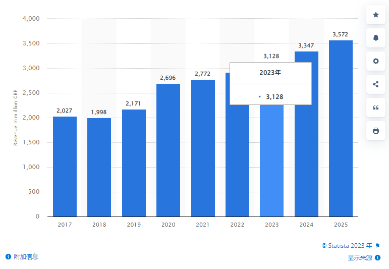 根据Statista网站公布的数据,到 2023 年,英国运动户外板块电商收入将达到31.28亿英镑。到 2027 年,用户数量预计将达到 2454 万。每个用户的平均收入 (ARPU) 预计将达到 201.10 美元。